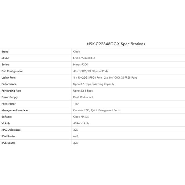 Cisco's Nexus 9200 Series, specifically the N9K-C92348GC-X, is designed to provide high-speed connectivity, flexibility, and scalability for data centers. Ideal for network engineers and IT procurement teams, this switch is suited for environments requiring robust performance and extensive port options.